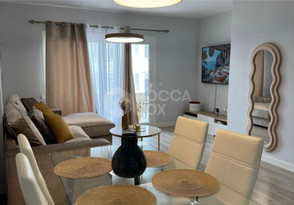 The interior of the apartment is fully furnished, featuring a fully fitted kitchen equipped with modern appliances, a dining room, and a comfortable living room. Central heating ensures a cosy environment during cooler months, while the covered terrace provides a perfect spot for al fresco dining or simply enjoying the garden and city views. Fitted wardrobes offer ample storage, maintaining the apartment's sleek and uncluttered aesthetic.